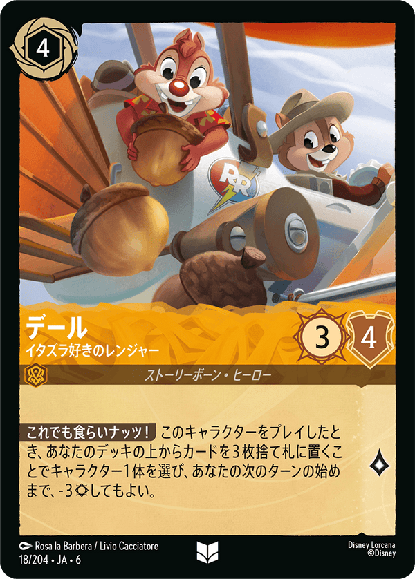 これでも食らいナッツ! このキャラクターをプレイしたとき、あなたのデッキの上からカードを3枚捨て札に置くことでキャラクター1体を選び、あなたの次のターンの始めまで、-3してもよい。