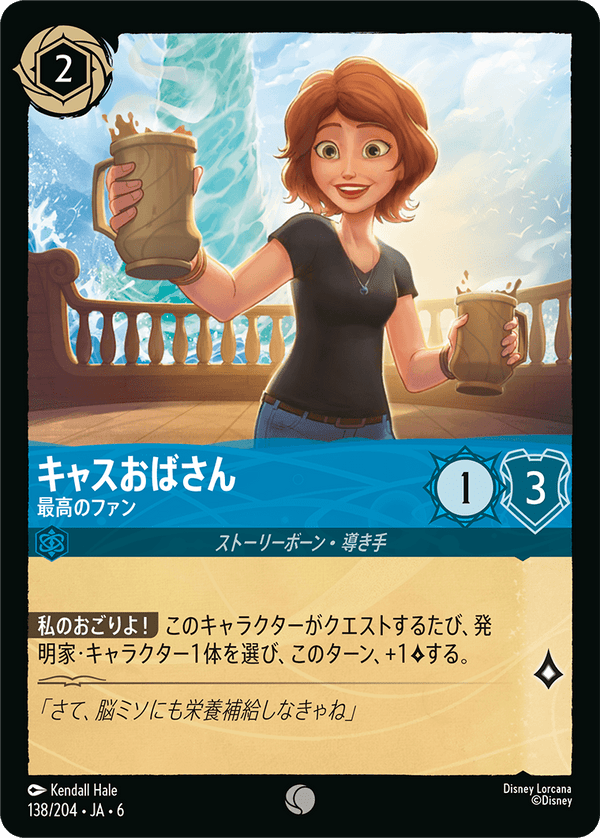 私のおごりよ! このキャラクターがクエストするたび、発明家・キャラクター1体を選び、このターン、+1する。