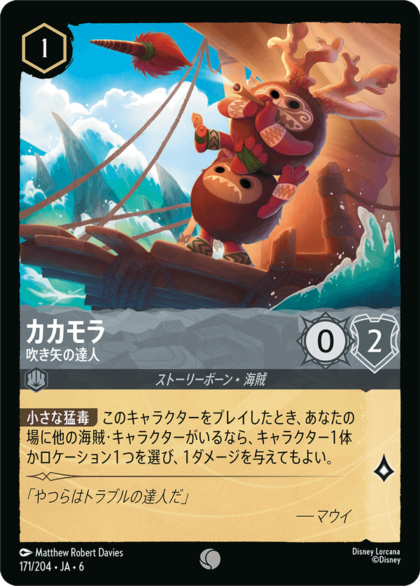 小さな猛毒 このキャラクターをプレイしたとき、あなたの場に他の海賊・キャラクターがいるなら、キャラクター1体かロケーション1つを選び、1ダメージを与えてもよい。
