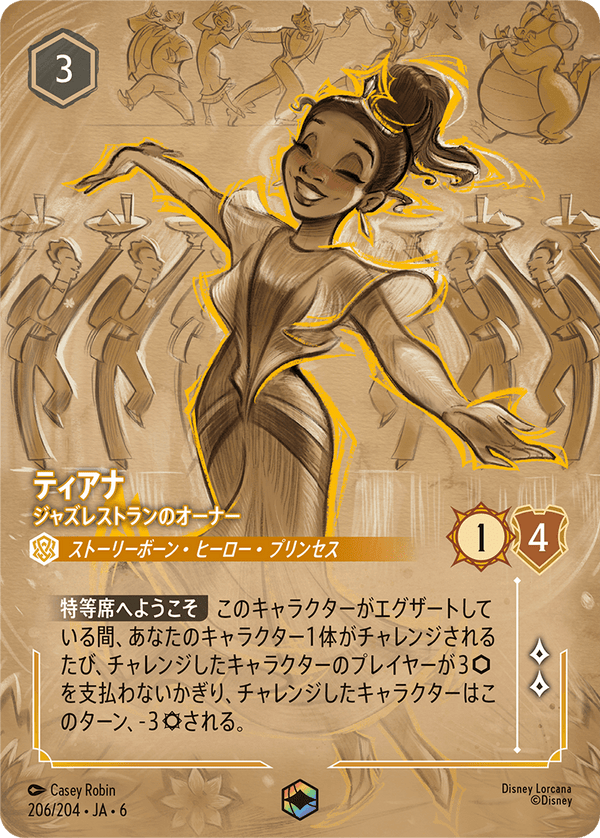特等席へようこそ このキャラクターがエグザートしている間、あなたのキャラクター1体がチャレンジされるたび、チャレンジしたキャラクターのプレイヤーが3を支払わないかぎり、チャレンジしたキャラクターはこのターン、-3される。