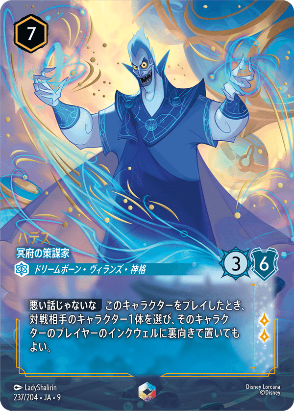 悪い話じゃないな このキャラクターをプレイしたとき、対戦相手のキャラクター1体を選び、そのキャラクターのプレイヤーのインクウェルに裏向きで置いてもよい。